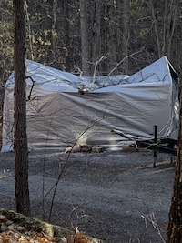When we drove down the driveway to the cottage, which took some time because there were another half dozen trees blocking it, we found that the tarp shelter that had kept the tractor out of the elements over the winter had taken a direct hit from a four inch diameter sugar maple branch. Luckily, the metal tube frame of the shelter did take the brunt of the impact by six inches of grace there was no damage to the tractor.