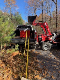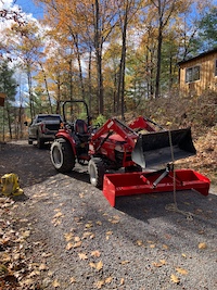 The first real job for the Mahindra was to spread and grade over 70 metric tonnes of 3/4 minus gravel along the driveway, over the lower parking area, and create a parking bay for the 7-ton landscaper trailer. Some prework had already gone in to clearing the trailer parking pad off the lake side of the driveway with the removal of some saplings and clearing off the layer of leaves and topsoil. That part of the property is pretty low and needed to dry out a bit before putting the gravel down - it would have made sense to get a load of 3 inch minus to help pack down the area before the top gravel went in, but there was some time and budget constraints. We'll see how the parking pad fairs over the winter and spring and if we need to add the larger stone we will.