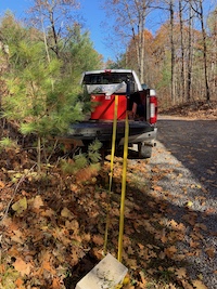 In August we had an arborist come and review the state of the trees within the cottage danger zone. He was very thorough and showed us a number of oaks that weren't the most healthy and how to monitor them. After lots of discussion we agreed that 6 pines and a white oak should come down completely and a number of other oaks should be trimmed of dead/dying branches. The cutting had to wait until after the first frost and the oaks had mostly completed their autumn colour change. The arborist and his crew arrived early one Saturday morning in October and in 6 hours had felled the trees and trimmed the dead branches - they were great. And they were kind enough to load the landscape trailer with the branches that we then carted off to various parts of the property for disposal. The only cleanup that is still ongoing is to remove as many of the trunk sections from the bottom of the hill to the north of the cottage and deposit them along the side of the driveway on the hill up to the cottage to help with gravel erosion.
