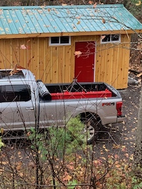 I found a bunch of listings, but most were in southern Ontario and over 8 hours driving round trip. Factor in time and gas and possible pain of a warranty issue and they were ruled out. But, a fiarly local listing popped up and I contacted the seller. Yes, he had one. Yes, it was a newer brand but made by the Amish locally in Ontario. Yes, I could pick it up tomorrow. Yes, the total price was $1,545. And yes, it was red. Done. I drove just under an hour to his shop, he loaded it into the back of the truck with a telehadler, and I was back to the cottage in time for a late lunch. Unfortunately it was pouring rain, so the offloading would have to wait until the next day. Most of the ones I'd been looking at online were made with 3/8 inch thick steel plate - this one was 1/2 inch and everything about it seemed to be better build quality than the mass produced brands. And 'supporting local' was an added bonus.
