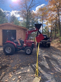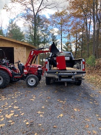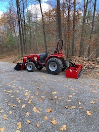 So here's some specifics about the Mahindra. Yes, they are an Indian company that is the world's largest producers of farm tractors. They are stout machines - not much plastic and the parts that matter are made from thick plate steel. The diesel engine is manufactured by Mitsubushi and is a 3 cylinder 1.3 litre displacement rated at 25.9hp. We selected the HST (hydrostatic) transmission option rather than the shuttle shift because it's easier to drive the tractor when you're doing lots of start/stop/reverse - just a forward "go" pedal and a reverse pedal, no shifting gears. It's got a category 1 3-point hitch on the back and a quick-attach loader on the front. The operator's station is a little tight at times for someone my size, but the controls are easy to use and I'm not on the machine for hours very often. We did not get a cab since it was going to be stored inside and the extra money didn't seem worth it.